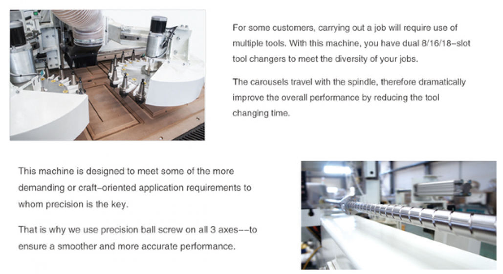 Featuring Italian auto tool changing spindle, Taiwan ball screw, Japanese servo driving system and planetary gear reducer that result in extra fine fininshing even on the most demanding applications.